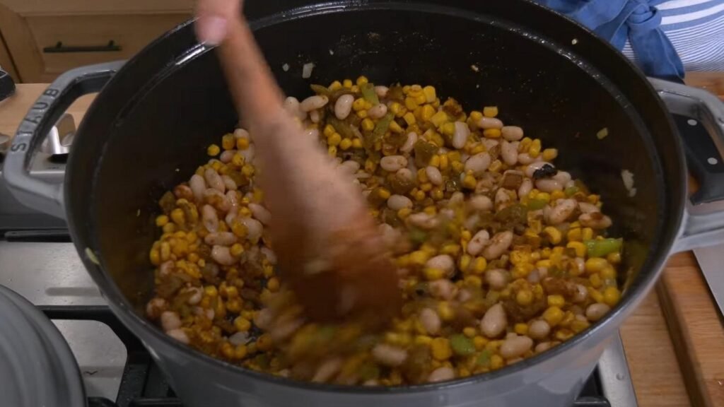 Add the Northern beans, corn kernels, and fire-roasted mild green chilies to the pot. Stir in the homemade taco seasoning to evenly coat the ingredients. Pour in the chicken stock, stirring to deglaze the pot and lift up any remaining browned bits.