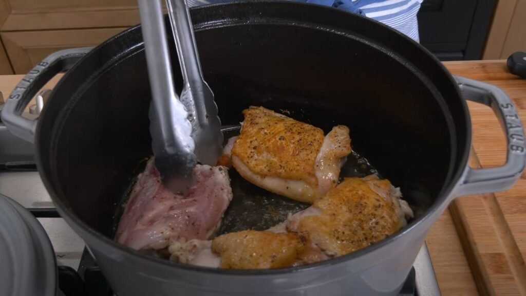A large Dutch oven is essential—it provides even heat distribution and prevents scorching during the long simmer. Its heavy bottom helps achieve a perfect sear on the chicken thighs, which is critical for building flavor.