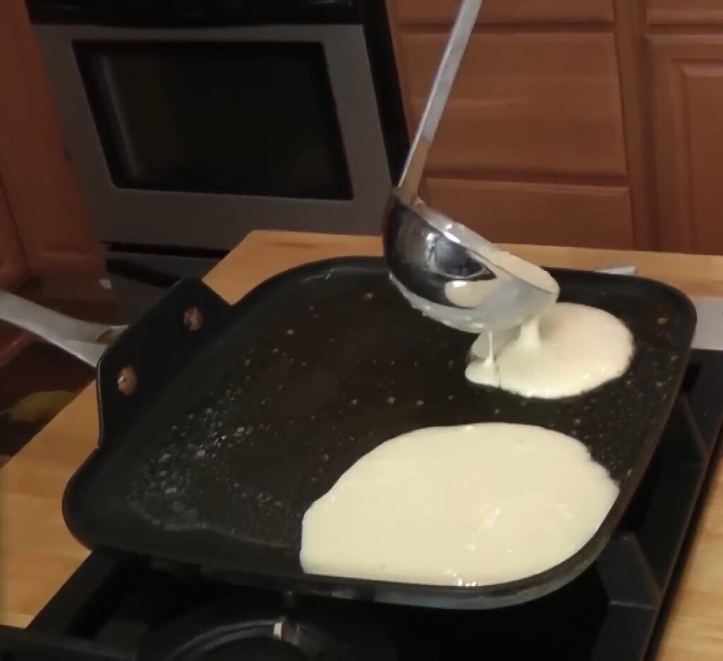 Try to keep the pancakes evenly sized so they cook at the same rate. Leave a little space between each pancake so they do not spread into one another.