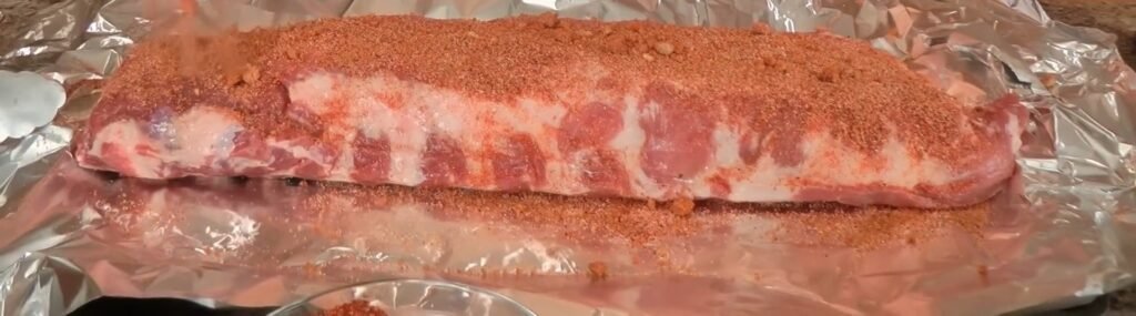 Flip the ribs over and apply the remaining rub to the other side with the same thorough patting motion, pressing firmly so the seasoning sticks and begins to flavor the meat deeply.