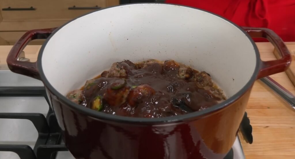 Return all seared meatballs to the Dutch oven, pour sauce over without disturbing shapes, and gently nudge to coat. Bring to gentle simmer, cover, and cook on low for 1 hour, stirring occasionally; sauce thins then clings beautifully. Meatballs tenderize, absorbing sweet-spicy notes; longer simmers enhance flavor. Crockpot alternative: transfer seared meatballs and sauce, cook low 2-4 hours, warm during serving. After 1 hour, they are sticky-sweet perfection.
