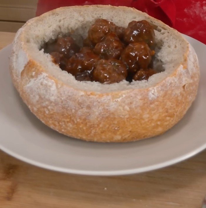 Hollow a round boule bread, leaving thick walls, for presentation; pour in meatballs, letting sauce soak bread. Skewer with cocktail toothpicks. Tear soaked bread at end for next-level enjoyment. Serve hot; leftovers reheat well. Total cook time yields crowd-pleasing results.
