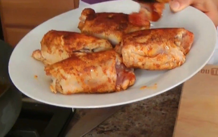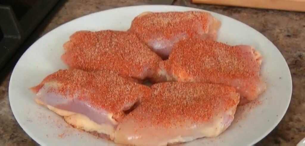 Leaving a bit of fat on the thighs adds succulence, so trim minimally if at all. This seasoning step infuses the meat with smoky, savory notes right from the start, building layers of flavor that carry through the entire dish. Distribute the spices uniformly to avoid any bland spots, and reserve the remaining half for the second side.
