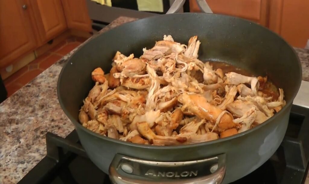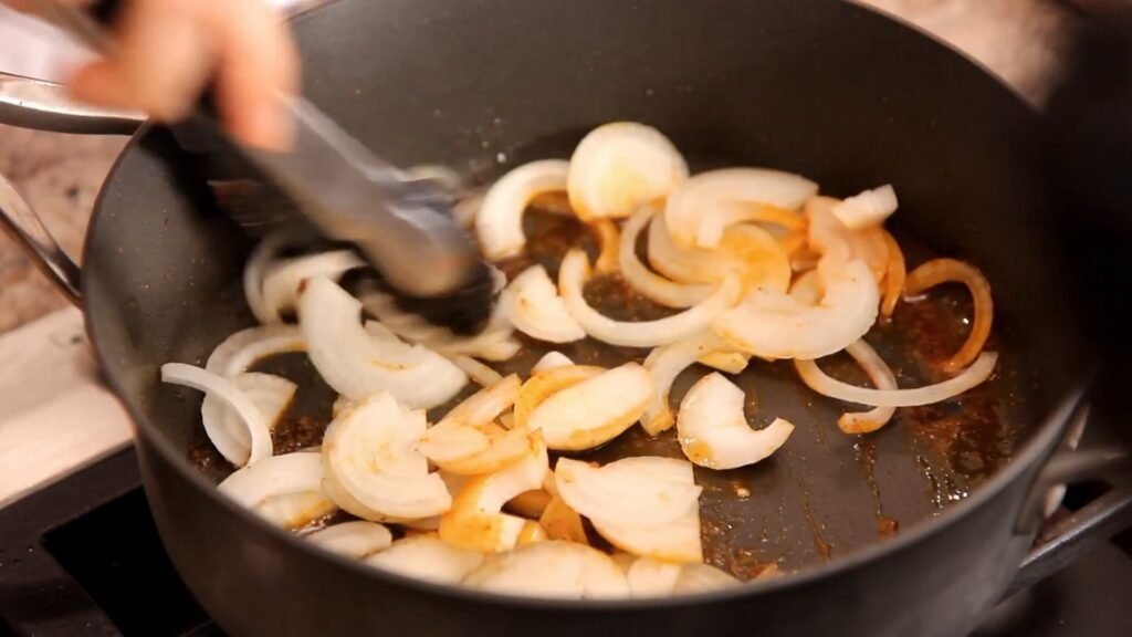 The residual spices in the oil coat the onions, infusing them with paprika, chili, and garlic notes. If the pan seems too dry, add a splash of water, but usually, the chicken fat and oil suffice. Soft onions melt into the final pulled chicken, providing texture without overpowering the dish.