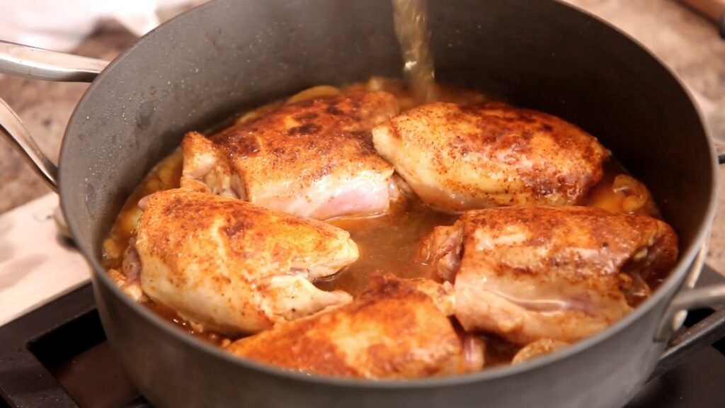 Lower the heat to medium-low, then pour in the 1/2 cup of chicken stock, scraping up any browned bits from the pan bottom with a wooden spoon; these bits are packed with umami. Return the seared chicken thighs to the skillet, nestling them into the onions and stock.