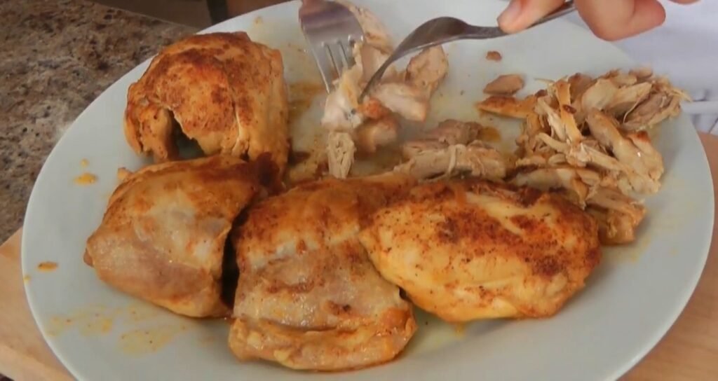 Transfer the cooked chicken to a clean plate and allow it to cool for just a few minutes until handleable. Using two forks, pull the chicken apart into shreds; you can shred as coarsely or finely as preferred, or even chop with a knife for chunkier pieces. I demonstrate this simple two-fork method, which takes under 2 minutes for 2 pounds. The chicken should shred effortlessly due to the simmering, yielding moist strands perfect for saucing. Discard any tough bits if present, but thighs are forgiving and mostly uniform.