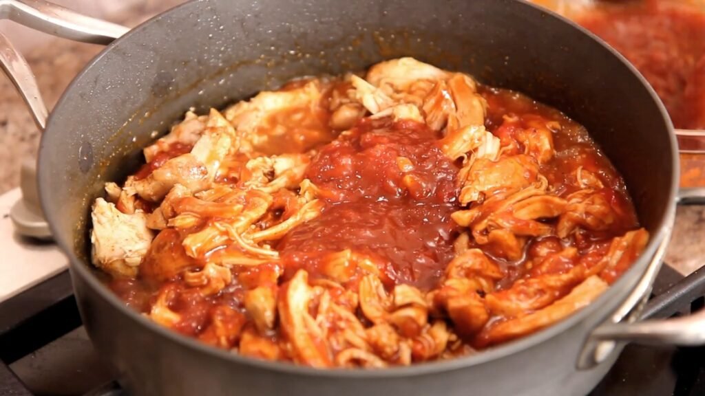 Cover with a lid and let simmer gently for about 20 minutes, or until the chicken is fully cooked through and reaches an internal temperature of 165 degrees Fahrenheit if checked with a thermometer. The low simmer breaks down the chicken fibers tenderly without drying it out, similar to slow cooking but in a fraction of the time. Avoid frequent lifting of the lid to maintain steam and consistent cooking.