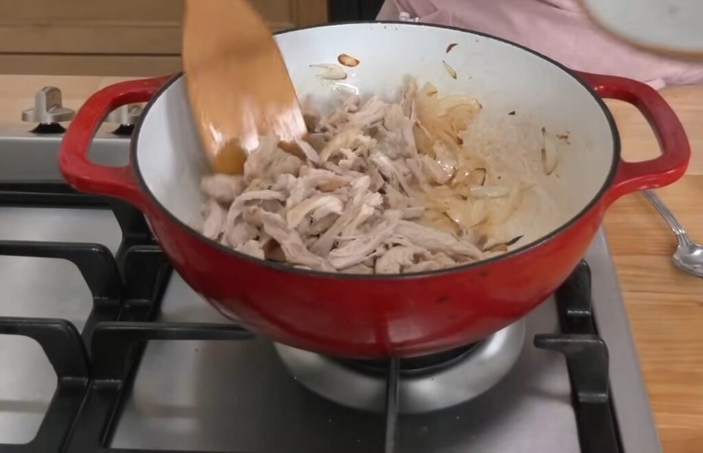 Add the shredded chicken to the pan and stir well to combine with the onions. Sprinkle in a barbecue seasoning blend, about 1 to 2 teaspoons, made from equal parts granulated garlic, granulated onion, and smoked paprika if you lack a pre-made mix. Stir thoroughly to coat every strand evenly.
