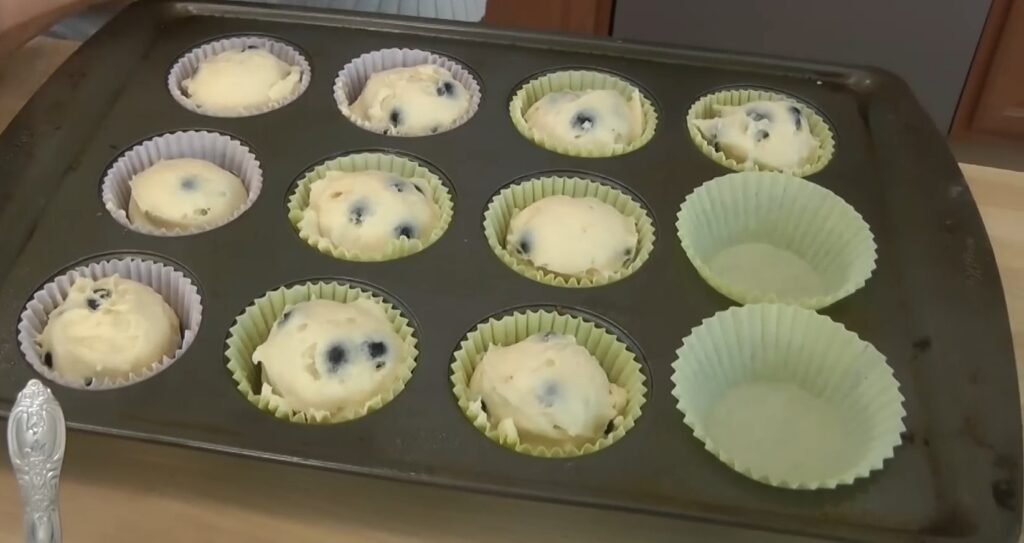 Use a large ice cream scoop or a spoon to evenly portion the batter into the prepared muffin tin liners. Filling each cup about two-thirds full allows enough room for the muffins to rise without overflowing.