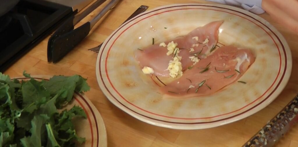 While the broccoli rabe cooks, prepare the chicken marinade in a shallow dish. Combine the finely minced or grated garlic clove, chopped rosemary leaves, 1 tablespoon of balsamic vinegar, a pinch of salt, and pepper. Mix well with a fork.