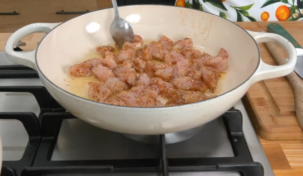 Start by cubing 1lb of chicken breast into bite-sized pieces for even cooking. Season generously with garlic and herb seasoning and paprika or Cajun seasoning, avoiding extra salt since these blends contain it. In a shallow ovenproof Dutch oven or large skillet, heat 1 Tbsp olive oil and 1 Tbsp unsalted butter over medium to medium-high heat until the butter melts and bubbles.​
