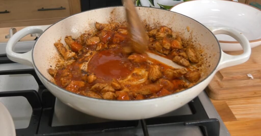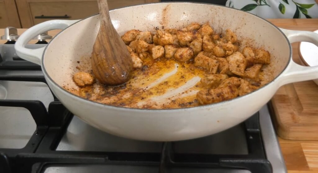 Add the seasoned chicken to the hot skillet. Stir occasionally as it cooks to about 70-75% doneness, around 5-7 minutes, until it turns opaque and lightly browned on the edges. This partial cooking prevents overdone chicken later. The flavorful fond from the chicken builds the base for the sauce.​​