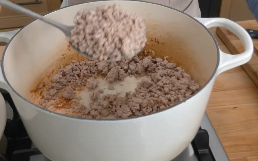 Start by heating 1 tablespoon of neutral oil in a large, heavy‑bottomed pot over medium to medium‑high heat. When the oil is hot, add the ground pork or chicken, breaking it up immediately with a wooden spoon so it cooks in small crumbles rather than large chunks.