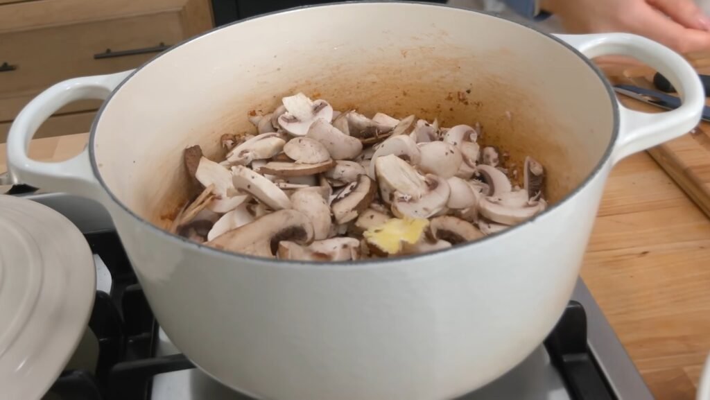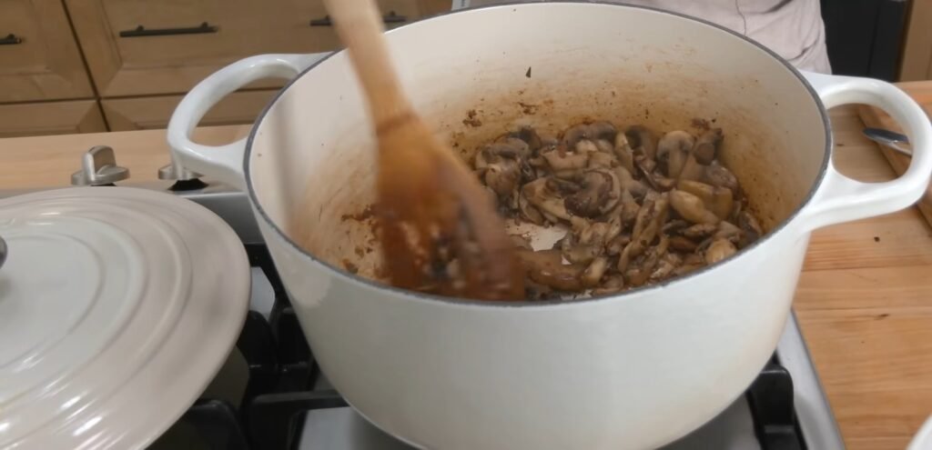 Bring the pot to a gentle simmer over medium heat, then lower the heat slightly to maintain a steady but not vigorous bubble. Let the broth simmer for around 30 minutes, or up to 40 if you have the time, which allows the mushrooms, meat, and seasonings to meld into a rich, layered broth.