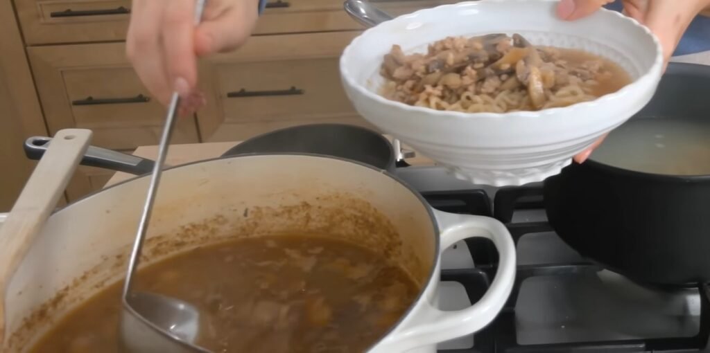 To assemble, place a portion of cooked ramen noodles in the bottom of each serving bowl, twirling them slightly with tongs so they sit in a neat mound. Ladle the hot miso‑mushroom‑pork broth generously over the noodles, making sure to scoop up some of the meat and mushrooms with each ladle so every bowl feels substantial.