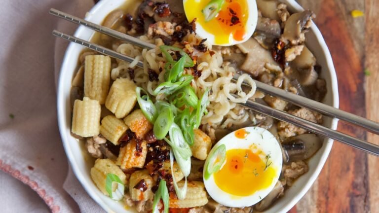 Nestle a few pieces of baby corn and a small handful of bean sprouts on one side of the bowl, then carefully place one or two egg halves on top of the noodles so the yolks are facing up. Scatter sliced scallions over everything, drizzle a little chili oil over the broth for color and heat, and serve immediately while the noodles are still bouncy and the broth is piping hot.