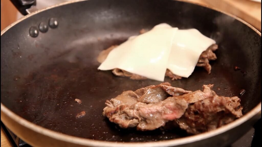 Lay slices of your preferred cheese over the beef and onion mixture in the pan. American cheese works wonderfully because it melts evenly and has a creamy texture that complements the savory beef. Cover the pan with a lid to trap heat and melt the cheese for about 2 minutes until it’s fully gooey and melted into the beef mixture.
