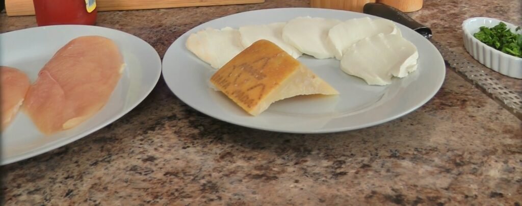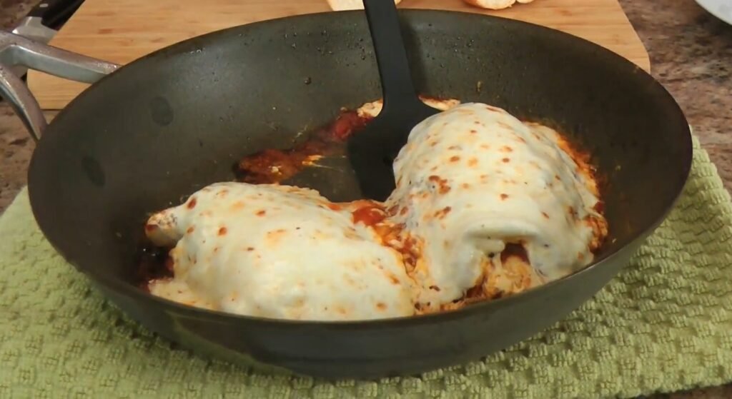 Preheat your broiler. Place thin slices of mozzarella over the sauced chicken, tearing pieces to fit perfectly. Generously grate Parmigiano Reggiano over the top of each. The combination of melting mozzarella and nutty parmesan creates that signature pull-apart cheese layer essential to chicken parm.