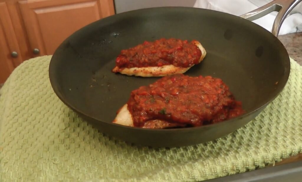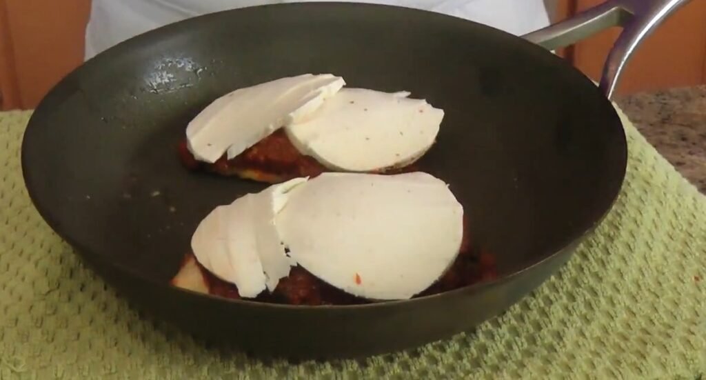 Once the chicken is cooked, spoon a generous amount of the thickened tomato sauce over each piece directly in the skillet. Spread it evenly to cover the tops. The heat-proof skillet allows the next step seamlessly. Ensure the sauce is hot and flavorful before proceeding.