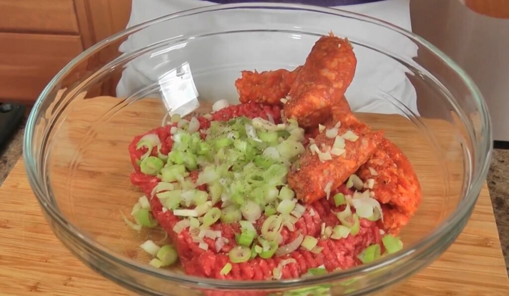 Start by gathering all your ingredients to ensure a smooth cooking process. Chop the 2 cloves of garlic finely and slice the 4 scallions into small pieces for even distribution in the meat mixture.