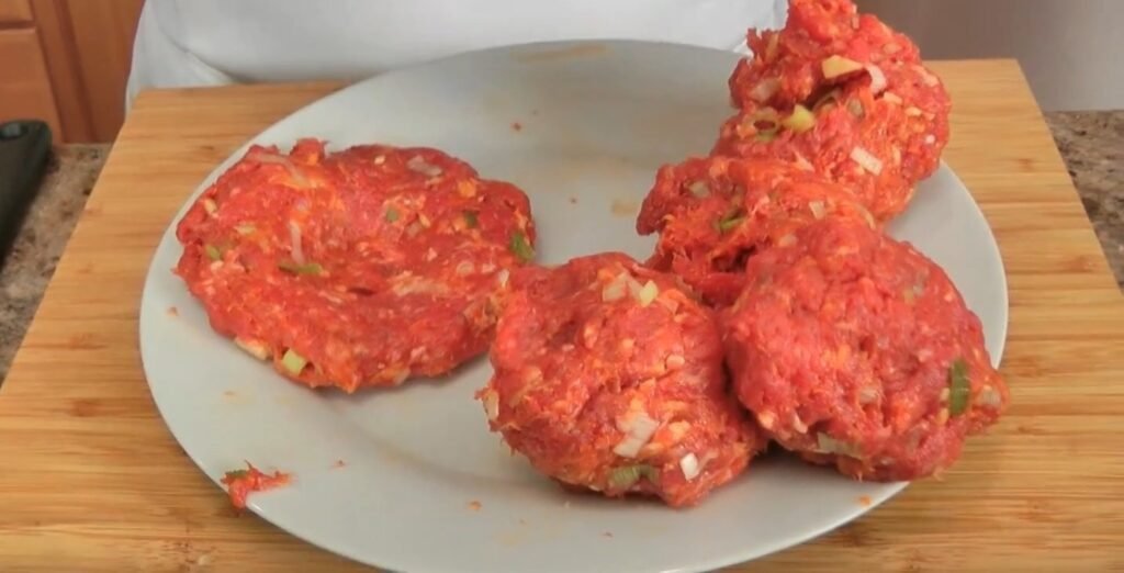 Form each portion into a ball, then flatten into burger patties about the width of your Kaiser rolls and roughly 1/2-inch thick. Press a shallow indentation in the center of each patty using your thumb or fingers; this prevents puffing during cooking, allowing even expansion for flat, professional-looking burgers.