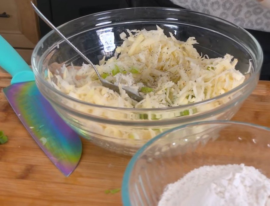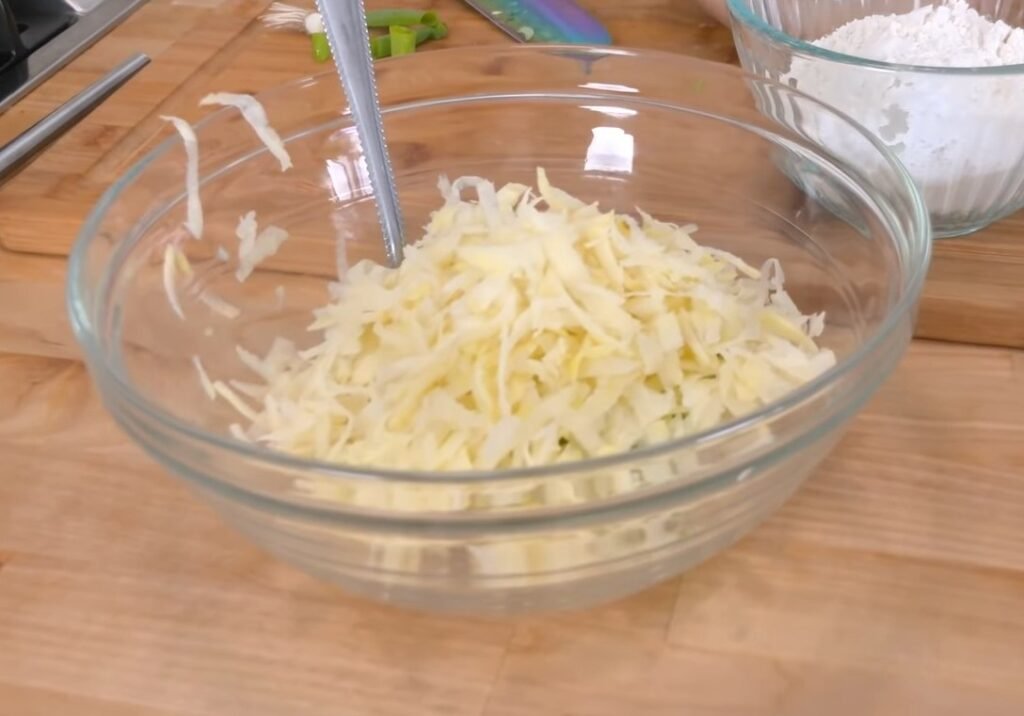 Start by working on the raw potatoes. After peeling and grating them, immediately place them in a bowl of cold water. This step is important because it removes excess starch and prevents discoloration. Let them sit for a few minutes.