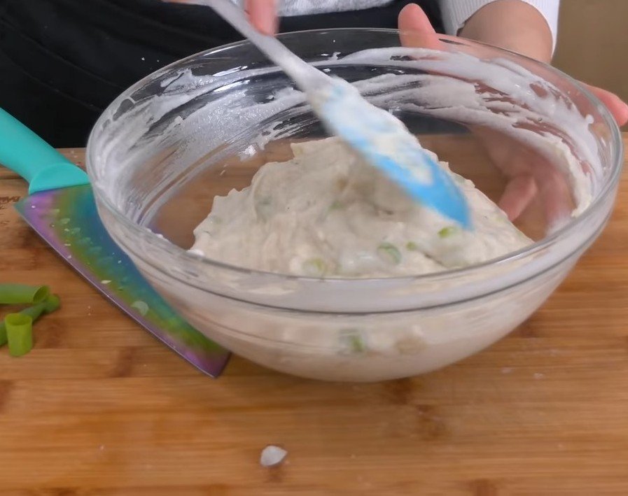 Add the chopped scallions and black pepper to the mixture. Stir well so the scallions are evenly spread throughout the batter.