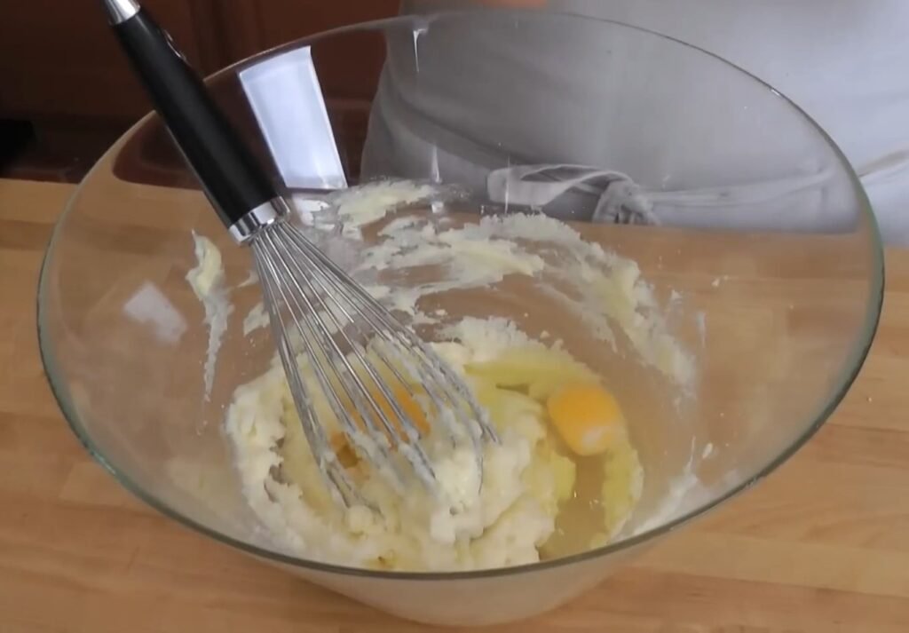 In a large bowl, cream together the room-temperature unsalted butter and sugar using a whisk, handheld mixer, or stand mixer until light and fluffy, which takes about 2-3 minutes. Add the two eggs and ½ teaspoon vanilla extract, mixing until fully incorporated and smooth.