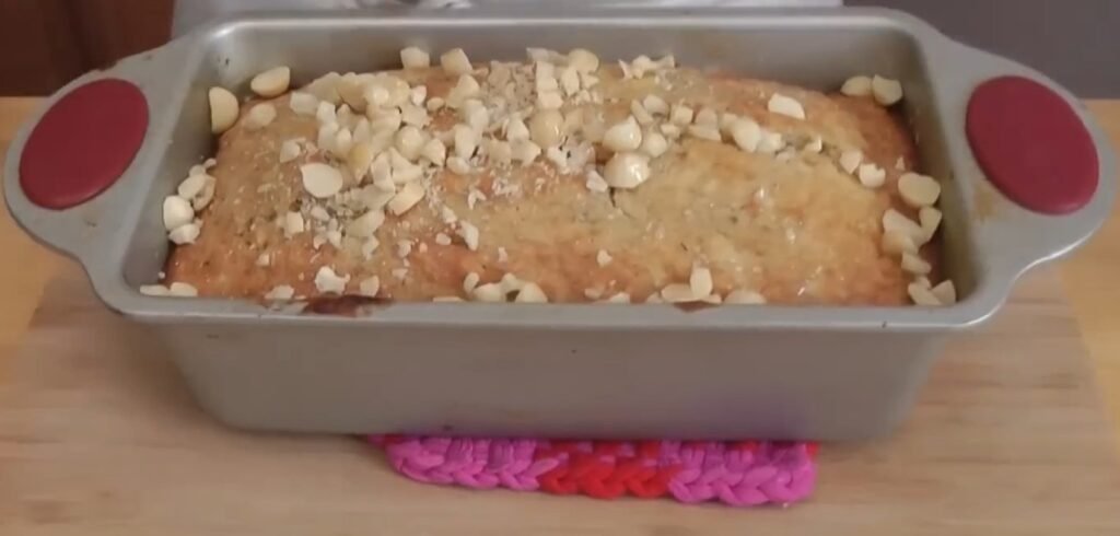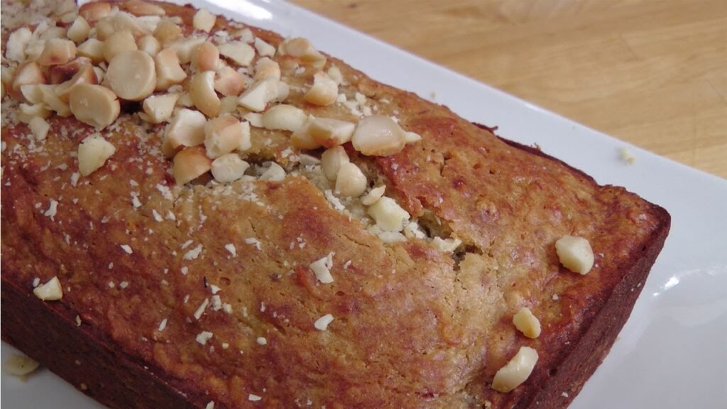 While baking, prepare the topping: melt 1 tablespoon of butter. After 50 minutes, brush the top of the loaf with the melted butter to act as “glue,” then sprinkle the roughly chopped macadamia nuts evenly over the surface, pressing lightly to adhere. Return to the oven for another 10 minutes until the nuts are golden and crispy and a toothpick tests clean.