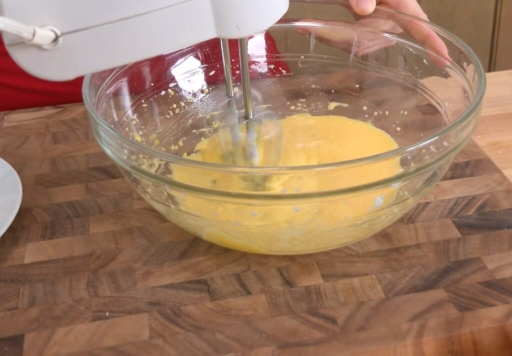 In another bowl, whisk together the egg yolks and granulated sugar until the mixture becomes slightly pale and smooth. Add the milk, melted butter, and vanilla extract. Continue whisking until everything is fully combined and the mixture looks creamy.
