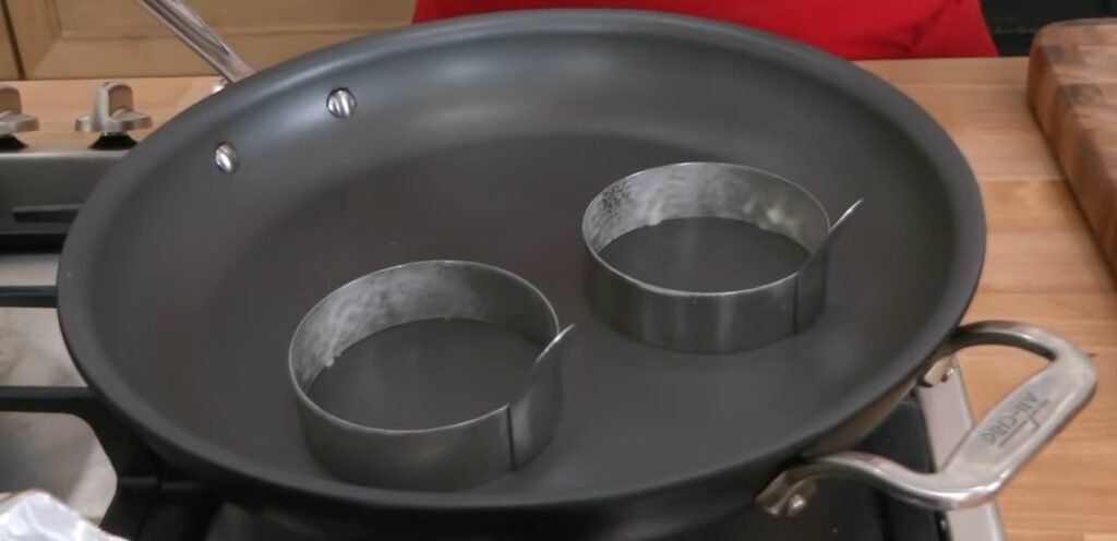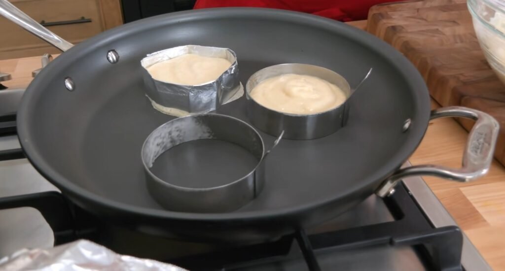 Place a non stick pan over very low heat. Lightly grease it with butter or oil. If you want tall pancakes, you can use ring molds, but they are optional.