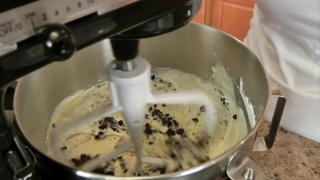 Once the base cheesecake mixture is smooth, add the reserved bag of crushed Oreo pieces. Switch the mixer to a very low speed, or use a spatula, and blend the crumbs in just until they are evenly dispersed throughout the batter.