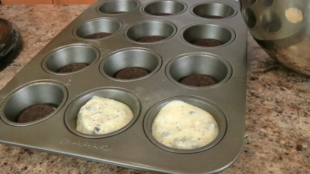 Place one whole Oreo cookie in the bottom of each muffin cup to act as the crust, centering it so the cheesecake bakes evenly around it. For this recipe, you will use 12 Oreos as bases if your pan makes 12 mini cheesecakes, and you will reserve the remaining cookies to crumble into the batter.