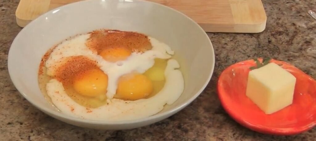 Start by cracking the three eggs into a mixing bowl. Add a generous pinch of seasoned salt, or if you prefer, a mix of salt, pepper, and a pinch of paprika for extra flavor. Pour in the splash of milk, just under a quarter cup, to create a smooth custard base.