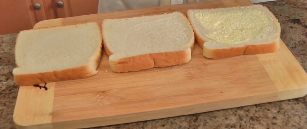 Take three slices of white sandwich bread. Spread a thin layer of the mayo-mustard mixture on one side of the first and second slices, about a teaspoon each. Keep the third slice plain for now.