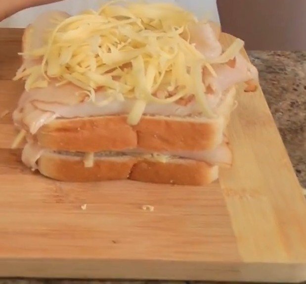 Start the top layer with turkey slices first, followed by more Gouda on top. The cheese here seals the final bread slice. Add the third slice of bread on top, spread side down if any remains. Press all layers firmly to compact. Repeat for the second sandwich.​