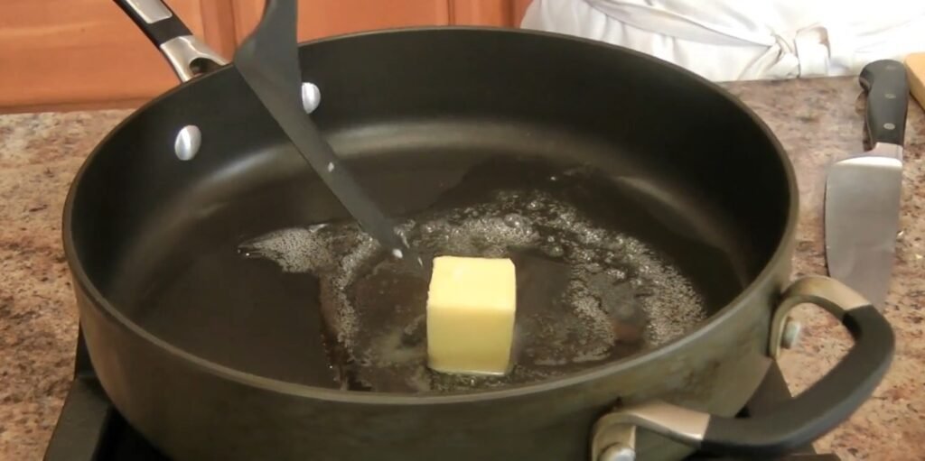 Place one tablespoon of vegetable oil in a skillet over medium heat. Add two tablespoons of butter once hot. Let it melt and foam, creating a flavorful fat base for golden browning.