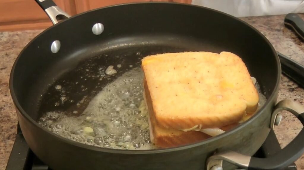 Medium heat prevents burning the exterior before the cheese melts. The oil raises the smoke point, while butter delivers taste. Swirl to coat evenly; the pan is ready when butter stops foaming.​