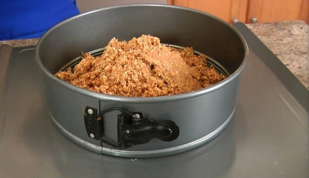 Lightly grease a 9-inch springform pan with melted butter or neutral oil to prevent sticking. Remove the base if desired for easier serving later. Dump the crust mixture into the pan and spread it evenly across the bottom.
