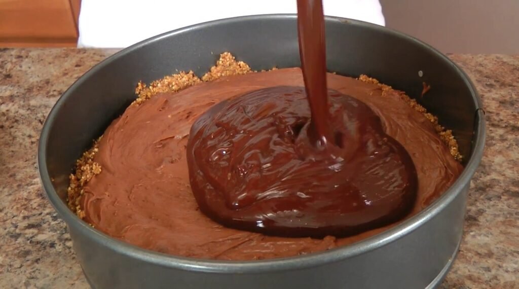 Remove cheesecake from fridge. Run a thin knife around edges to loosen. Pour ganache over filling, spreading evenly to edges with spatula.