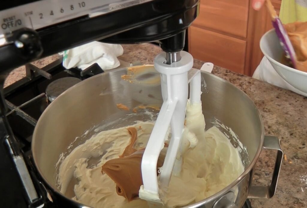 Add 1-1/2 cups of smooth peanut butter to the whipped cream cheese. Continue mixing on medium speed for another minute until fully blended. The mixture turns into a thick, creamy base reminiscent of peanut butter mousse. Scrape down the sides to ensure even distribution.
