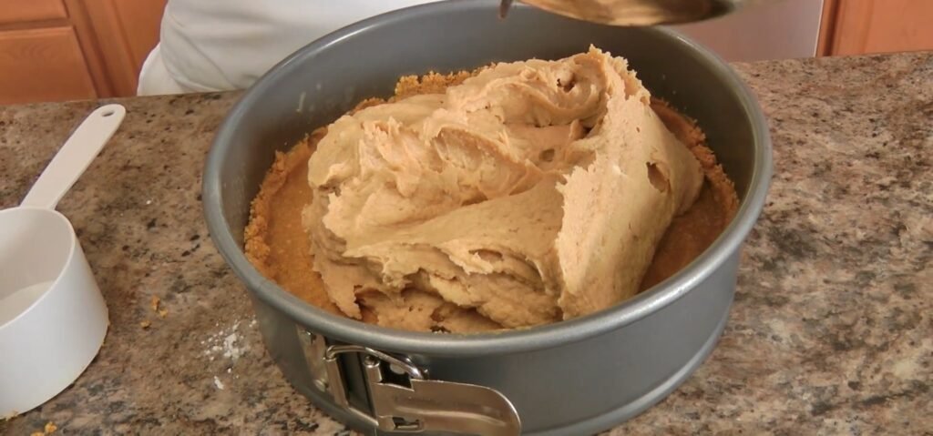 Pour the peanut butter filling over the chilled crust. Use a spatula to spread evenly, smoothing the top for a professional finish. Tap the pan gently on the counter to release air bubbles. Cover with a plate to protect from fridge odors and refrigerate overnight, at least 8 hours, for proper setting.
