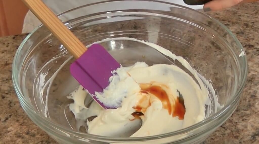 In a bowl, add the softened cream cheese and whisk until smooth. Add the vanilla extract and confectioner’s sugar, then mix well.