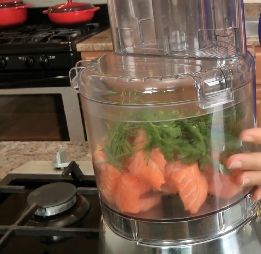 Start by taking your 1 lb fresh salmon filet with the skin already removed by your fishmonger. Cut the salmon into large chunks to make processing easier. This ensures even chopping and helps the mixture bind well later.
