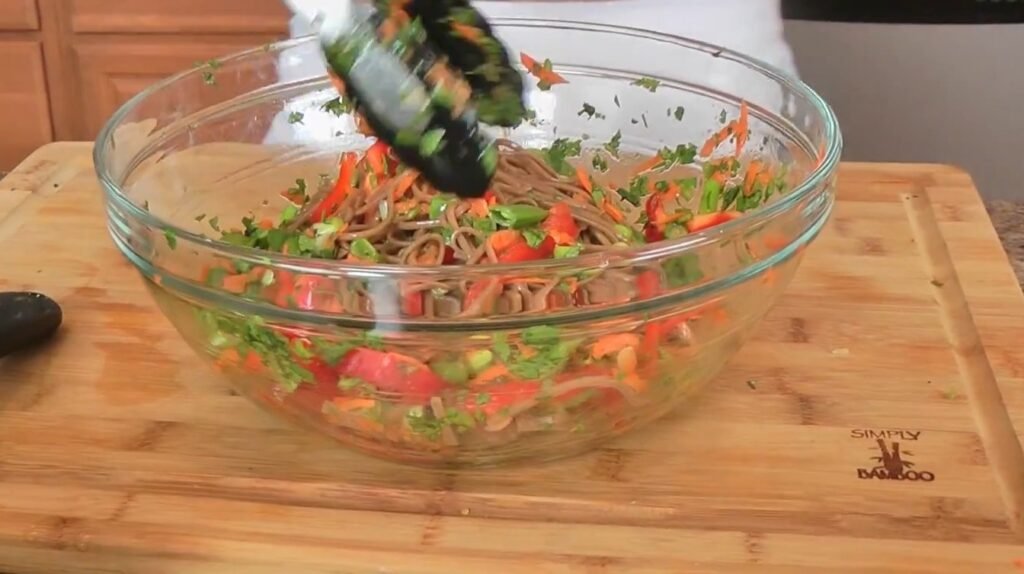 Once everything is well combined, cover the bowl and transfer the salad to the refrigerator for about one hour before serving so the flavors can develop. During this rest time, the noodles absorb some of the dressing, the vegetables gently marinate and the aromatics soften, turning a tasty salad into something deeper and more harmonious. When you are ready to serve, give the salad another quick toss to redistribute any dressing that may have settled, then taste and adjust with an extra squeeze of lime or a tiny splash of soy sauce if needed. Serve the soba noodle salad chilled or at cool room temperature, topped with the reserved herbs for a fresh finish that makes it ideal for lunches, picnics or easy entertaining.