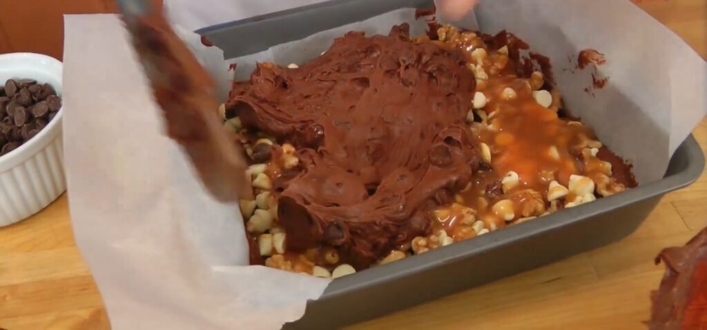 To the reserved 1 cup batter, fold in 1 cup semisweet chocolate chips gently with a spatula until just distributed. Do not overmix to keep chips intact for melty bursts. Spoon this mixture over the caramel layer, spreading carefully with the spatula to cover completely. It may be thick, so work patiently for evenness. Some caramel or chips peeking through adds visual appeal. Smooth the top lightly.