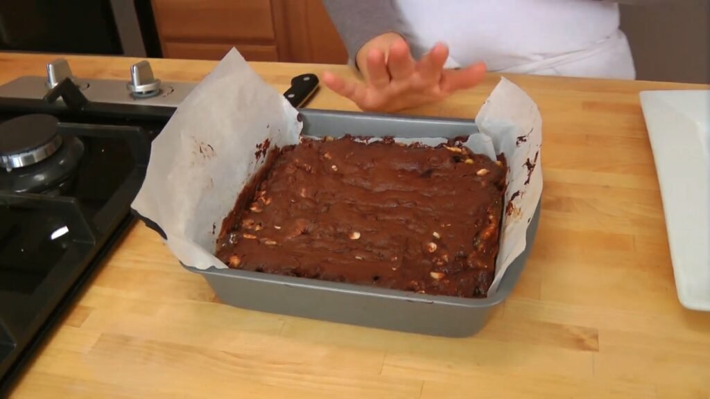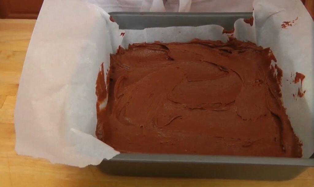 Spray the bottom lightly again over the parchment to secure it firmly in place. This double preparation prevents any brownie from sticking and makes cleanup effortless, setting the foundation for flawless presentation. Press the parchment gently into the corners for a snug fit.