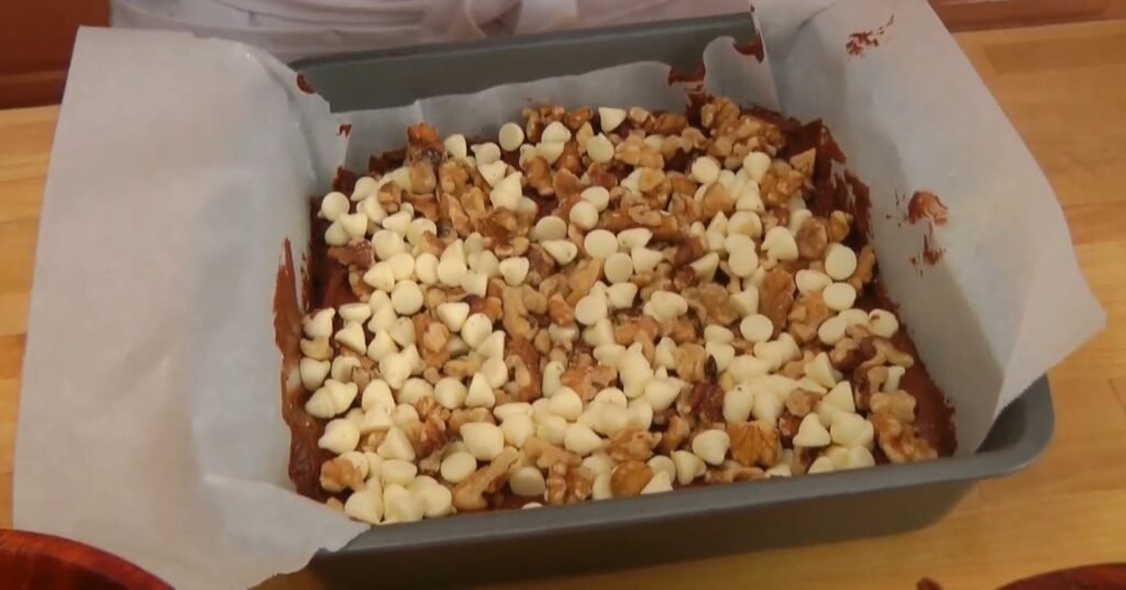 Evenly sprinkle 1 cup chopped walnuts across the batter surface, distributing them so every brownie square gets some crunch. Follow with 1 cup white chocolate chips, scattering generously for pockets of creamy sweetness. Press them lightly into the batter with your fingertips to anchor them without sinking too deep. Walnuts add nutty contrast and texture, complementing the soft batter perfectly. Adjust spacing for even coverage.