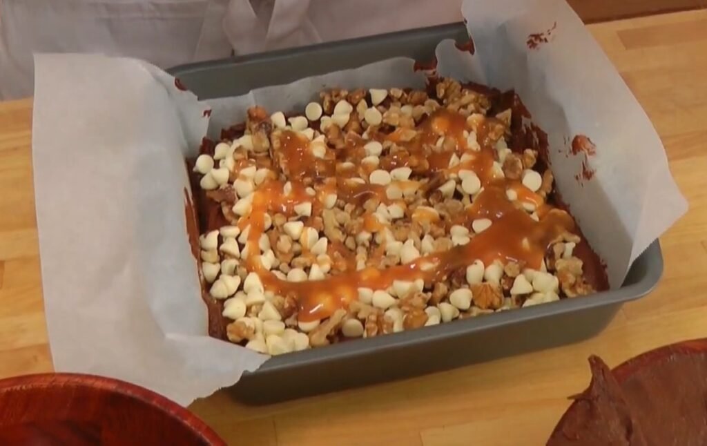 Drizzle 2/3 cup caramel sauce evenly over the walnuts and white chocolate chips, allowing it to cascade into crevices. Use a spoon or squeeze bottle for controlled streams, covering the entire surface without pooling too heavily in spots. Store-bought works great, or homemade for deeper flavor. The caramel will melt and fuse during baking, creating gooey ribbons throughout. Tilt the pan slightly if needed for full coverage.
