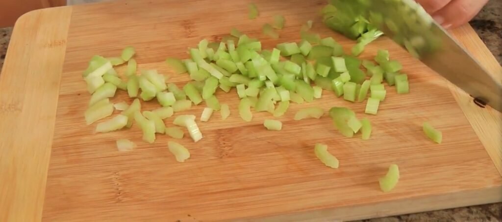 This technique allows for even, fine pieces that blend seamlessly into the tuna without overpowering the texture. Rock your knife back and forth gently to chop the strips into tiny dices, about the size of small peas. Include the leafy green tops of the celery as they add a fresh, herbaceous note that enhances the overall flavor profile. Aim for uniform pieces so every bite delivers consistent crunch.